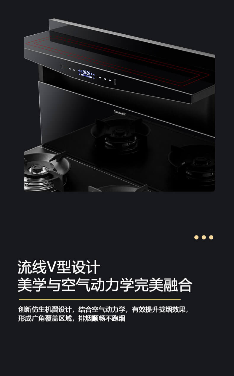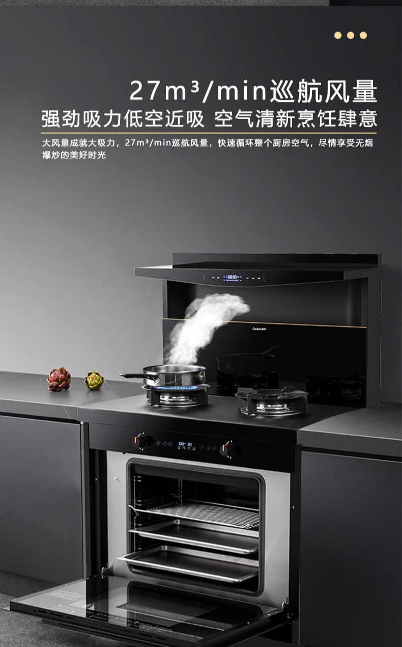 1050Pa風壓,智能變頻電機,揮手智控,曲面滑體無縫風道,一體瓷膜內膽,一鍵熱融清洗,5kW大火力