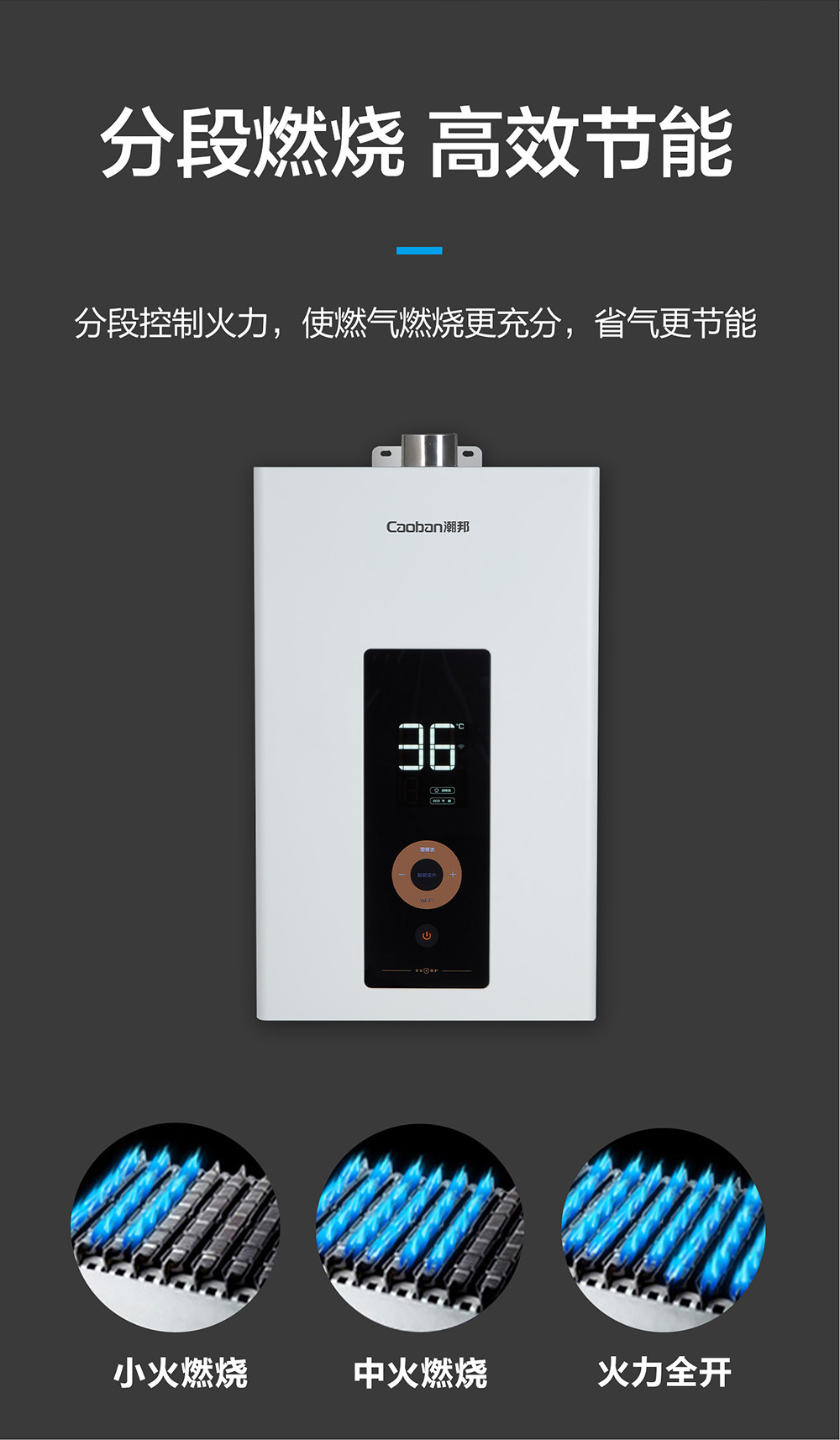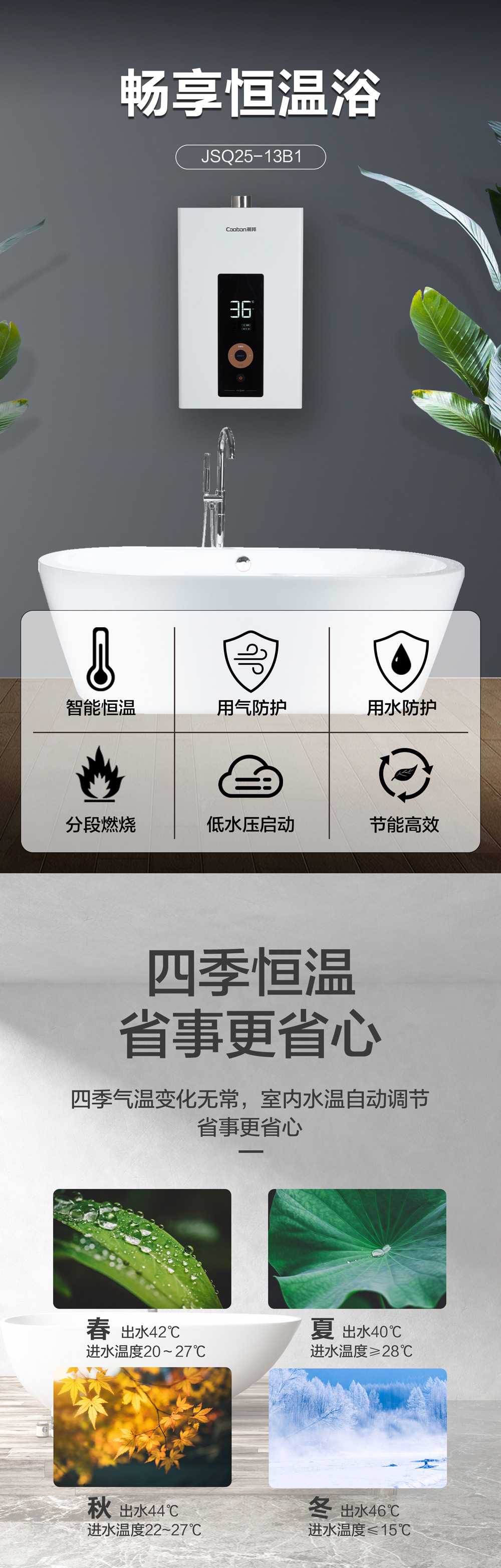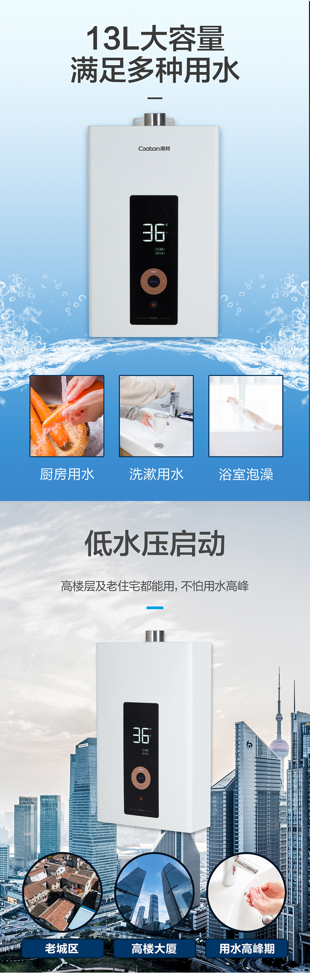 智能恒溫,用氣用水防護(hù),低水壓啟動。